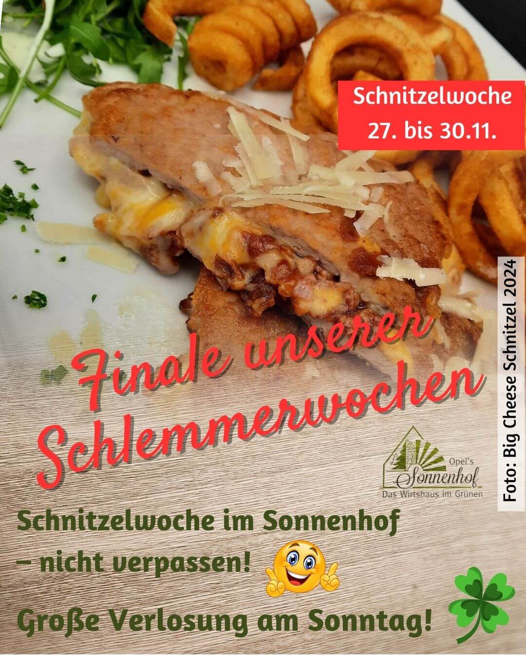 Zum Abschluss der Schlemmerwochen erwartet euch eine Auswahl, die neugierig macht und Lust auf einen Besuch weckt. Auf der Karte stehen Klassiker, kreative Variationen und Spezialitäten, die es meist nur während der Schnitzelwochen gibt – darunter das Jacky-Schnitzel, das Schäfer-Cordon-Bleu, ein Tomaten-Mozzarella-Schnitzel, Piccata Milanese und ein feines Reh-Schnitzel aus der Nuss. Die Namen verraten genug, um Appetit zu machen, aber nicht alles – entdeckt selbst, was sich dahinter verbirgt. Die Karte findet ihr ab Dienstag hier auf der Homepage.