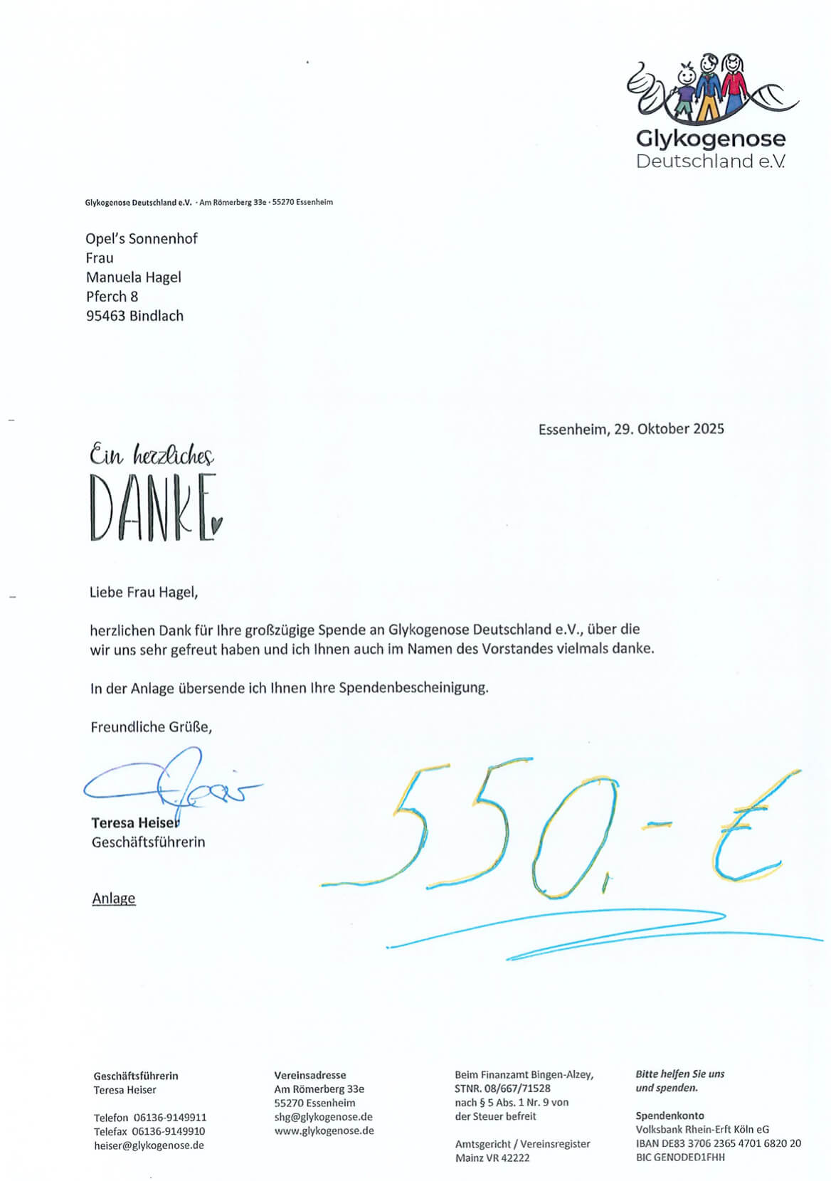 Im Jahr 2024 konnten wir dank eurer Unterstützung erneut eine Spende – diesmal in Höhe von 550 Euro – an die Selbsthilfegruppe Glykogenose Deutschland e.V. überweisen. Dieser Betrag stammt aus der Schlemmerwochen-Verlosung und den Spenden unserer Gäste. Wir sind stolz auf dieses Ergebnis – ohne euch wäre das nicht möglich gewesen.